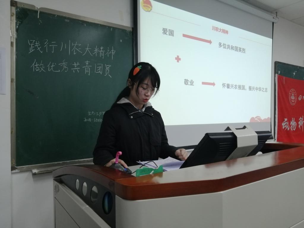 12月1日晚,动物科技学院团委组织部在第四教学楼B区405教室,开展主题团校第四讲“践行川农大精神,做优秀共青团员”,本次团校主讲人为大一年级组织部成员周茂林。