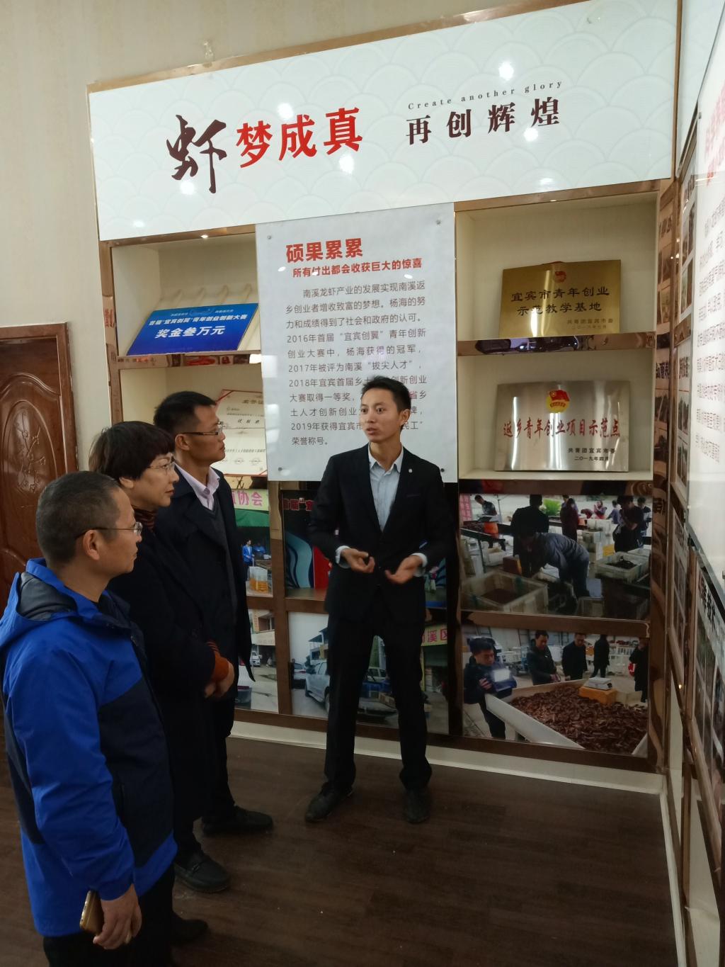 付瑞琼一行首先去宜宾南溪区看望了2019年四川返乡青年创业创新领军人才、受到央视《远方的家》专题报道、水产2010级校友杨海。杨海带老师们参观了他的高品质小龙虾养殖基地,并介绍了5年来他利用自己在学校所学到知识并大胆创新,通过反复的试验、摸索和实践,创建了适应当地气候和土壤特点的高品质小龙虾养殖新技术,筹建了南溪龙虾产业文化馆,现已建立1200多亩的小龙虾养殖基地,高品质的小龙虾每天源源不断的运送到北上广深等一线城市的高端消费市场。同时,他自办养殖示范基地,通过“技术下乡、产业兴村、解决就业、创新模式”等四个方面助力当地精准扶贫工作,举办技术讲座200余场,培训养殖人员10000余人次,带动近100户贫困户脱贫。他倡导成立了南溪水产养殖协会并当选会长,目前协会共有6300余亩小龙虾养殖规模,年产量达到240万斤,年产值达到7200万元。