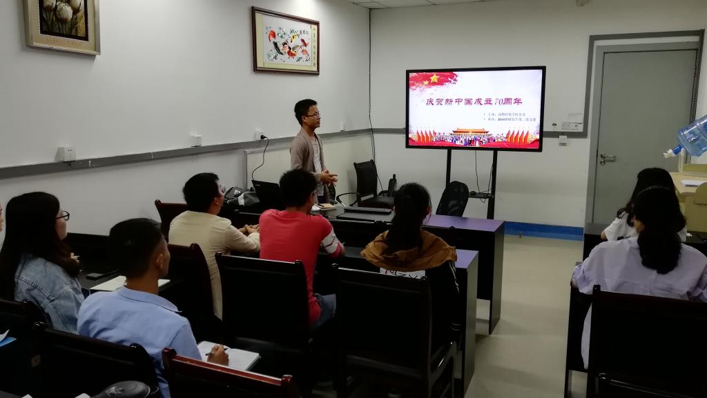 在中华人民共和国成立70周年之际,动物科技学院2019级研究生第二党支部在六教627召开党组织生活,为了献礼祖国70周年庆典以及培养学生党员的爱国情怀此次活动分为“合唱《我和我的祖国》”、“观看开国大典视频”、“交流祖国70周年来的变化”三个部分。支部副书记钟亮主持,支部成员应到15人,实到11人。