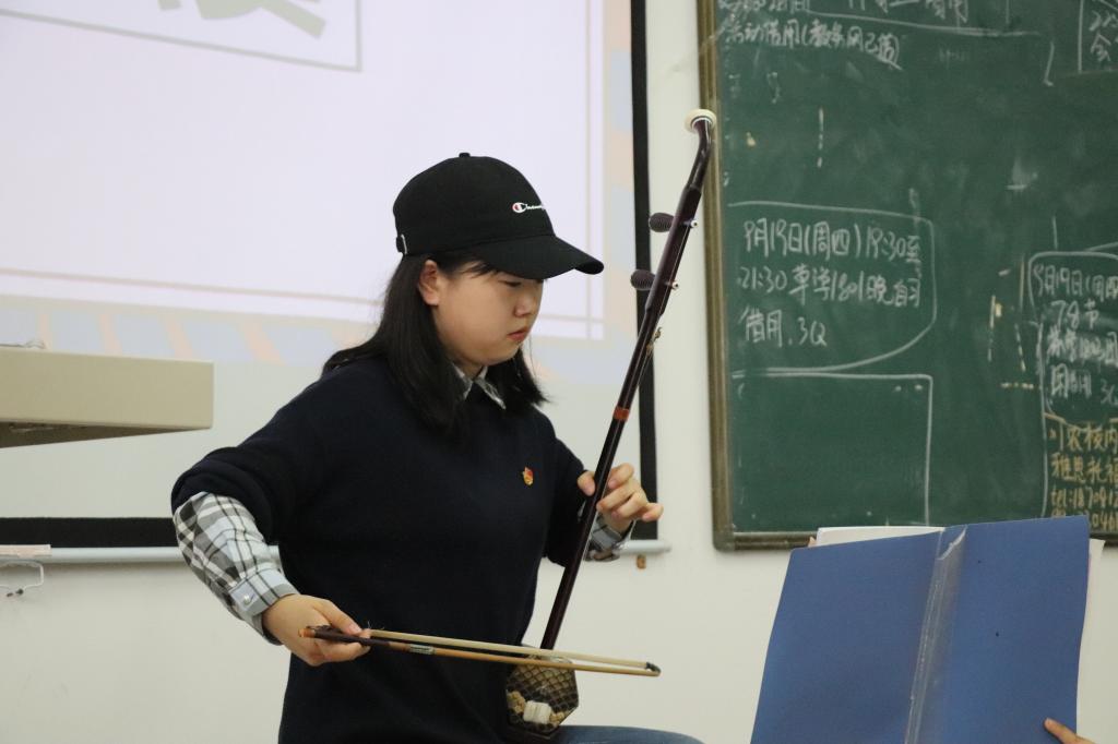 “自古以来,红梅就象征着坚忍不拔、自强不息的精神品质,迎接它出生的不是和煦的春风,而是凛冽的北风;滋润它成长的不是晶莹的甘露;而是肃杀的严寒”随着动科1803班吴霜同学的二胡独奏,大家都被激扬顿挫的乐章和高超的演奏手法所感染,仿佛眼前都呈现出了革命先烈江姐不屈不挠的伟大形象。
