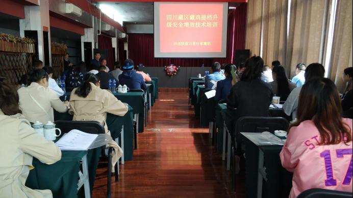 7月16日和7月31日-8月2日,在甘孜州科技局、康定市农牧农村和科技局、甘孜州畜科所组织下,刘益平一行针对泸定、康定周边养殖户、农技员、驻村干部和畜牧业相关从业人员各100余人,在康定市分别开展了以“藏鸡保种选育与扩繁推广”和“四川藏区藏鸡提档升级安全增效技术培训”为主题的养殖技术的基层科普培训和县级科技培训。在培训中,讲解了四川藏鸡的概况以及相关养殖技术知识外,发放了团队编写的《藏鸡养殖技术百问百答》技术手册,还对养殖户所遇到的饲养技术问题一一答疑,特别对当前非洲猪瘟疫病防控带来的畜牧行业的影响进行了相关探讨,并现场到达养殖户养殖地点进行现场养殖技术指导。