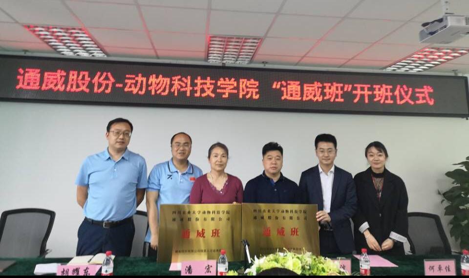 4月23日下午,动科学院与通威股份有限公司在7-1012会议室举行动科校企合作“通威班”开班仪式顺利举行。动物科技学院党委书记潘宏、党办主任胡耀东、副主任董尧、通威股份华西片区人力资源总监向波,通威班班主任侯佳薇参加了开班仪式。
