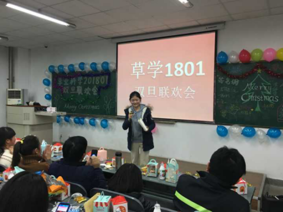 12月25日,草学18级1班在四教B区602教室举行了“双旦”联欢会。晚会邀请了动物科技学院副院长张新全教授、草学系主任马啸教授作为嘉宾与小班同学一起欢庆佳节。