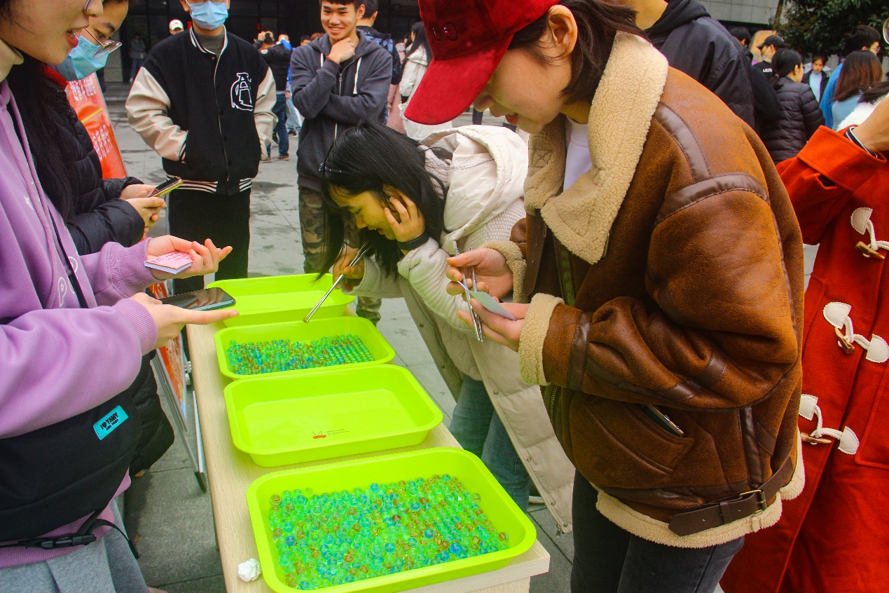 游园活动包括海底捞月、蒙眼摸牛、自由落体、投乒乓球、飞镖、套圈、步步为营等项目。有趣的游戏引得现场欢笑声不断,同学们参与项目根据成绩获得一、二、三等奖奖票可用于兑换零食礼包抽纸、洗衣液、牙膏和电动牙刷等奖品。