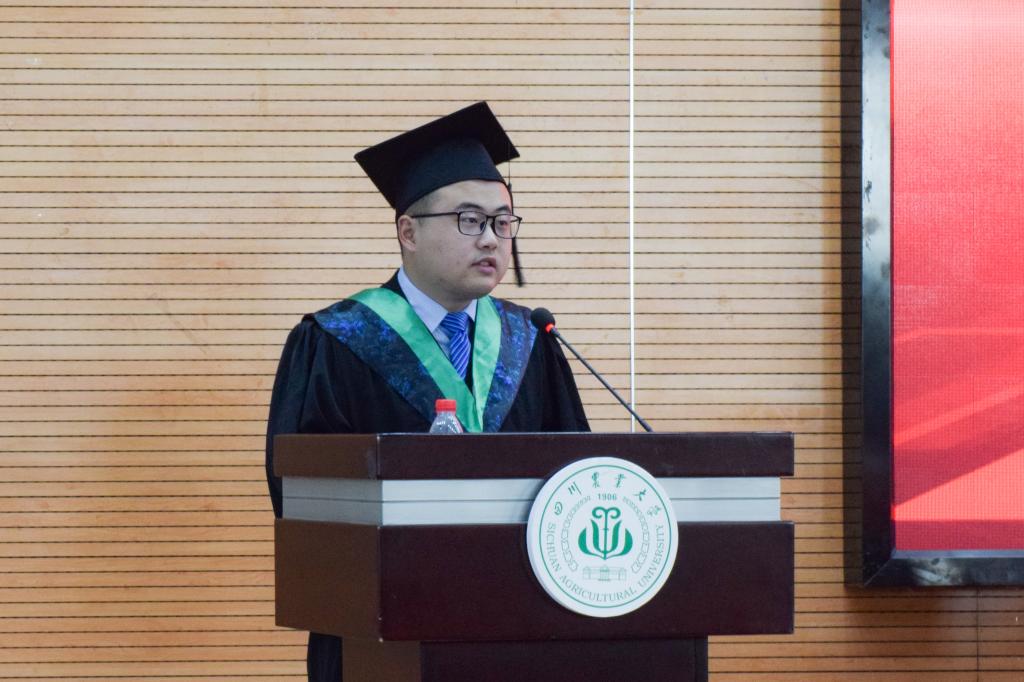 水产养殖学2017级1班徐铭作为毕业生代表发言。他回顾了在川农大求学的四年来学校的巨大变化,以风趣的语言讲述了自己和川农大动科院之间的故事,表达了对学院、对老师以及同学们的感谢之情,代表毕业生们对学校、学院表达了浓浓的不舍,为一起毕业的同伴们送上最真诚的祝福。