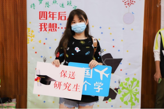 “保送研究生”“创业当老板”“月薪15000”“出国留个学”“考个公务员”“谈个小恋爱”六个“小目标”和“四年后,我想……”学院设置的留影墙引起这位同学的极大兴趣。“我还想读研究生继续深造,这就我接下来的目标!”她不假思索选择了“保送研究生”和“出国留个学”两张目标板,略带紧张而又坚定地说。