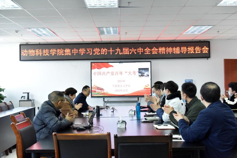 颜怀坤首先为师生们梳理了党的三次“决议”的历史背景及意义,并领学了十九届六中全会决议中“一个历史定位、两个地位确立、三个理论飞跃、四个历史时期、五大历史意义、十条宝贵经验”六个方面的核心内容。随后,他以《中国共产党百年“大考”之路》为题,重点向师生们详细剖析了党在建设过程中遇到的种种“大考”——新民主主义的“大考”、社会主义革命和建设的“大考”、改革开放和社会主义建设的“大考”及新时代中国特色社会主义建设的“大考”,以及针对不同时期“大考”给出的答案。颜怀坤勉励学院师生:“新一代青年身处百年未有之大变局,不应在前人的荫庇之下安逸享乐,而应该把握机遇、迎接挑战;动科院师生更应以学科优势为依托,深入贯彻十九届六中全会精神,从党史中汲取强大的前行动力,发扬吃苦耐劳、敢于突破自我的精神,勿忘昨天的苦难辉煌,无愧今天的使命担当,不负明天的伟大梦想,交出人民满意的时代答卷。”