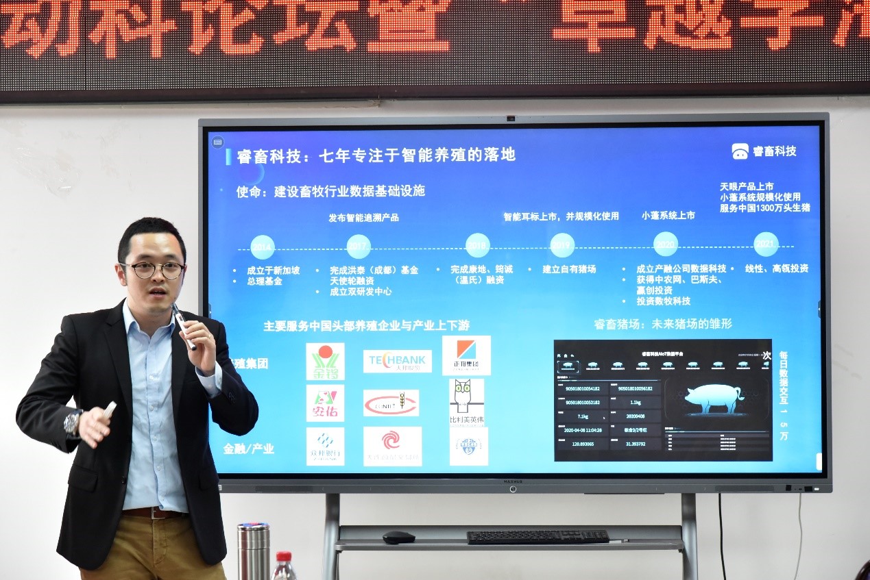 活动特邀睿畜电子科技有限公司联合创始人兼CEO兰嵩博士和深圳市数牧科技有限公司CEO黄河先生为主讲嘉宾。兰嵩以“为什么畜牧行业需要‘数智’化”为题,介绍了畜牧行业市场化和规模化程度持续提高,亟需科技手段提升效率,智慧养猪就是通过AIoT技术搭建起整套生猪个体数据采集系统,提供由人工智能和物联网技术驱动的分析判断,从而帮助传统养殖企业提质增效。如利用智能传感穿戴系统,可实时监测生猪生理指数,实现疾病早期预警、排卵期的精准预测以及饲料的精准投放;利用智能耳标,通过升级RFID芯片实现生猪进销存管理智能化和全程可追溯;利用“天眼”系统可实现智能点数、智能测重,有效改善以往生猪交易中人工测定的效率及准确率。黄河以“‘科技+金融’助力生猪产业发展”为题,介绍了如何整合银行、饲料企业、养殖企业资源,打造新型生态圈,来解决养殖户融资痛点的解决方案,满足养殖过程中稳定的饲料供给及资金支持,为养殖行业提供全方位、专业化、便捷化的供应链金融服务。