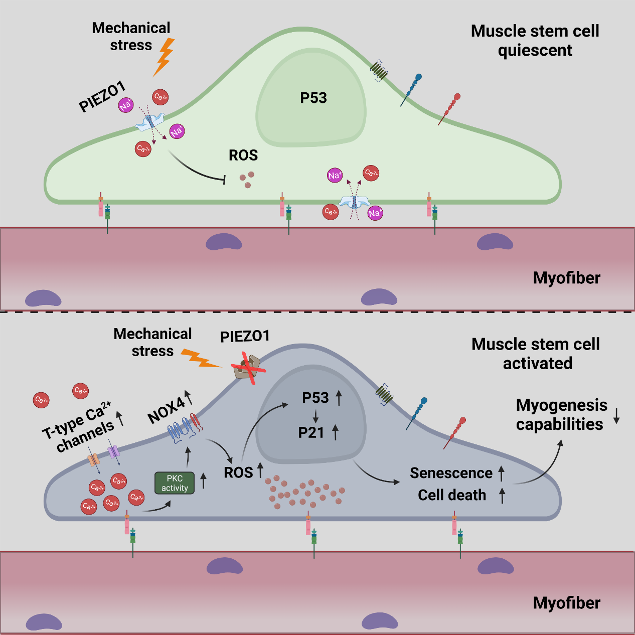 我院朱砺教授团队与德国马普心肺研究所Thomas Braun教授团队合作在机械压力刺激调控骨骼肌稳态维持及机制研究的最新进展显示:PIEZO1在“静息”状态的MuSC中高度富集,其表达量随MuSC激活而逐步降低。通过构建MuSC特异性敲除PIEZO1小鼠模型,发现PIEZO1缺失会导致MuSC异常激活,并且激活的MuSC无法正常自我复制更新(Self-renewal),从而限制了小鼠骨骼肌的再生能力。进一步的研究发现PIEZO1缺失会导致活性氧物质(reactive oxygen specis,ROS)在MuSC中大量积累,引起ROS依赖性的P53-P21信号轴过度激活,继而介导MuSC提前衰老(senescence),导致MuSC“静息态”维持、 增殖分化等功能失调,最终损害了骨骼肌的正常修复和再生。此外,对PIEZO1抑制MuSC中ROS积累的具体分子机制的进一步解析发现,PIEZO1缺失引起的T型Ca2+通道蛋白的代偿性高表达会将胞外Ca2+离子过度泵入胞内,导致MuSC胞内Ca2+离子浓度异常增高。随后,胞内过盛的Ca2+离子会激活Ca2+依赖的cPKC-NOX4酶连激活反应,刺激MuSC大量产出ROS分子。该研究详细探究了PIEZO1在调控成体肌肉干细胞稳态维持及肌再生修复中的具体功能与机制,首次揭示了PIEZO1和T型Ca2+通道蛋白的代偿性表达机制,进一步证明机械力信号在肌肉干细胞生理行为及骨骼肌稳态调节过程中具有重要功能。研究结果可为PIEZO1治疗Duchenne肌营养不良症、骨骼肌代谢相关疾病治疗提供参考。