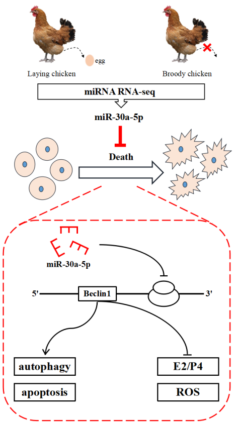 就巢性是禽类的一种母性行为,是家禽自然繁殖后代的一种本能,具体表现为排卵退化和排卵终止,其实质就是卵泡闭锁。我院尹华东教授团队以自主培育的国家级优质鸡配套系“天府肉鸡”为模型,挖掘筛选调控鸡卵泡发育的重要候选因子。通过对正常生长发育的鸡卵泡和闭锁卵泡miRNA转录组测序发现miR-30a-5p表达量存在明显差异,推测其可能影响卵泡发育。随后,在体外培养的鸡原代卵泡颗粒细胞中发现miR-30a-5p靶向抑制细胞自噬标志因子Beclin1基因的表达;干扰和过表达miR-30a-5p后,通过qPCR、Western Blot、流式细胞术、ELISA等技术检测发现miR-30a-5p可明显影响颗粒细胞凋亡、自噬以及雌二醇和孕酮激素合成;通过共聚焦显微镜和透射电子显微镜观察发现miR-30a-5p还可影响自噬溶酶体产生。综上结果表明,miR-30a-5p通过干扰Beclin1基因表达抑制鸡卵泡颗粒细胞的自噬和凋亡,并促进类固醇激素的产生,从而缓解卵泡萎缩。本研究结果为系统全面的解析小RNA调控鸡卵泡发育的分子机理提供基础,为进一步提高我国地方鸡的繁殖性能提供理论依据。