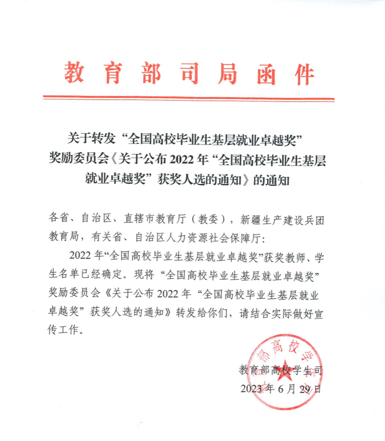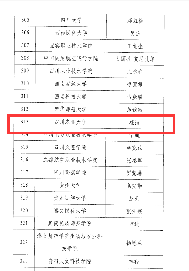 近日,学院水产养殖专业2014届毕业生杨海荣获教育部颁发的2022年“全国高校毕业生基层就业卓越奖”。本次奖励全国共有60位教师和398位学生获评,四川省共有19位学生获评,杨海是我校唯一获评学生。