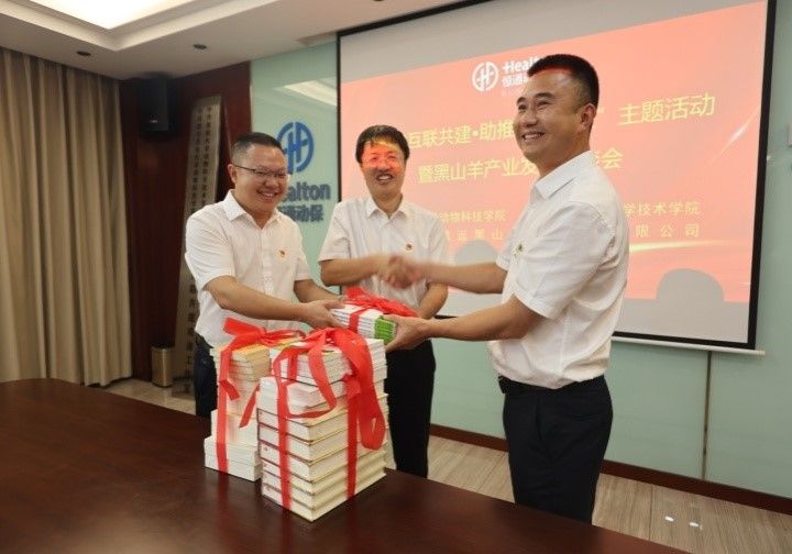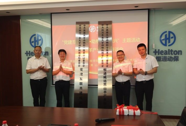 在全体与会人员的见证下,学院和西南大学动科院与四川恒通集团签订产学研战略合作协议,并举行党建互联共建成渝工作室、恒通黑山羊产业联合党支部、恒通威远黑山羊科技服务站成立和授牌仪式,及共建农家图书馆赠书仪式。