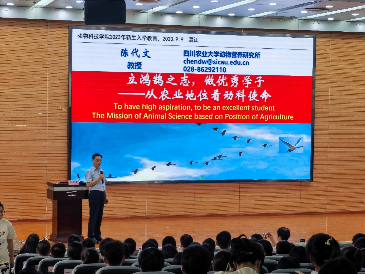 陈代文教授从“什么是大学”、“川农大是什么样的大学”开场,以《从农业地位看动科使命》为题,通过分析农业科学与生命科学、资源环境科学、健康学等学科关系,结合国际社会转型面临的资源、人口、环境、疾病等诸多问题,详细讲述了农业现代化是实现中国梦的前提和基础,介绍了现代畜牧业是最复杂的高新技术产业,未来畜牧业是自动化、智能化的产业,发展现代畜牧业“一靠人才,二靠科技,根本靠教育”。他寄语同学们,要胸怀国之大者,努力成人成才;做好人生规划,明确奋斗目标;不断锤炼三观,善于做人做事;潜心钻研业务,全面提升技能,努力成为立大志、明大德、成大才、担大任的时代新畜科人。