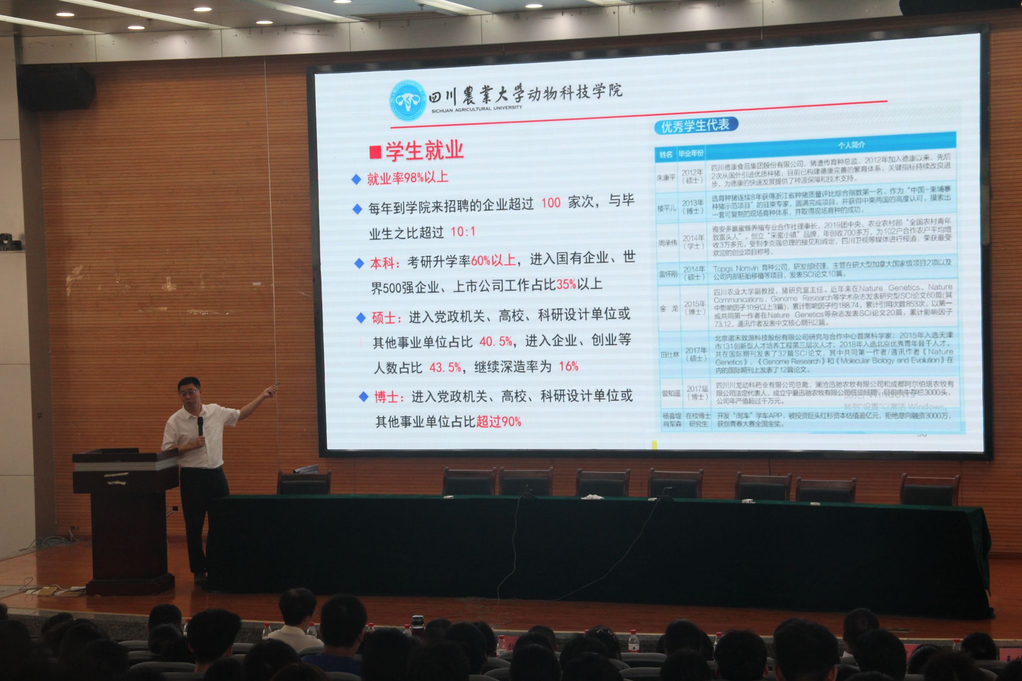 朱砺向新生介绍了四川农业大学的百年悠久办学历史、动物科技学院的基本情况以及动物科学专业情况,并对全体2023级新生提出了殷切期望,他表示:“历史悠久、教学科研实力雄厚的动科院为同学们提供了广阔的舞台与无限的机会,希望全体新生明确奋斗目标,静心学习、潜心钻研、全面发展,成为国家所需要的高层次人才。”杨淞向新生介绍了水产养殖学专业情况,“孕育30年”、“奠基12年”、“快速发展11年”、“飞跃发展”,这几个部分带领新生回顾了学院水产养殖学专业一步步发展壮大的历程,祝愿大家学有所成,“鱼”生幸福!