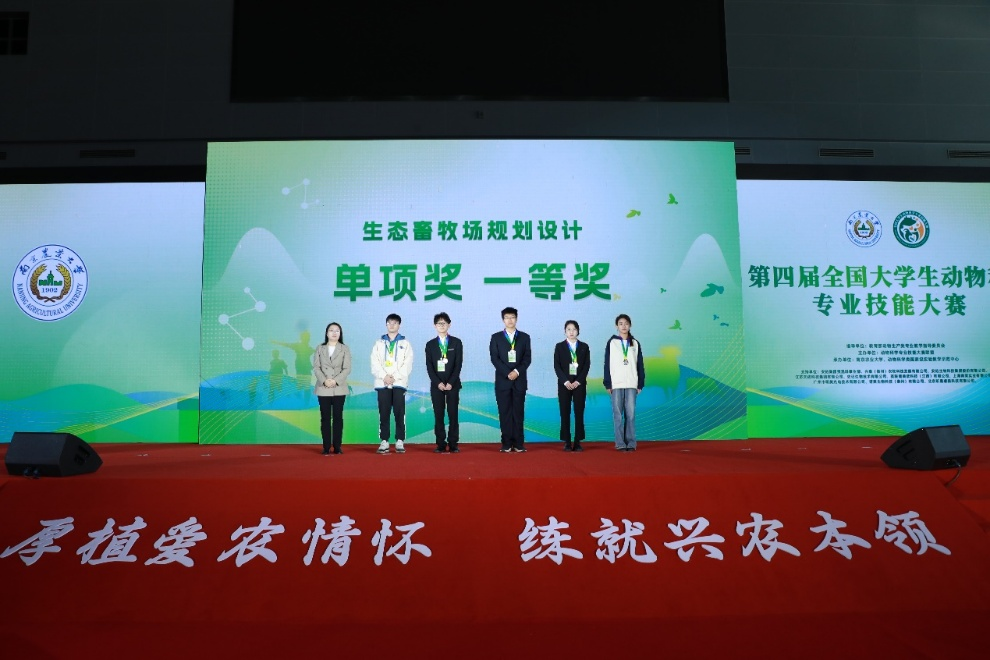 我校组建了颜皓宇、童江、李雪杨、曾雯婷、姜抒含5位动物科学专业本科生参赛队,学院党委书记何桦带队,副院长赵小玲以及指导教师张明、白林、沈林園、郝晓霞、张燕等赴南京农业大学参加比赛。我校代表队以扎实的理论基础,熟练的操作技能和默契的团队配合脱颖而出,赢得了在场裁判的一致好评,最终摘得第四届全国大学生动物科学技能大赛团体一等奖;生态畜牧场规划设计项目获得单项一等奖。闭幕式上,我校白林老师作为项目裁判长点评项目比赛情况。