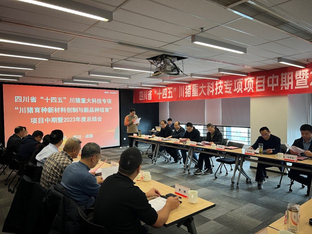1月12日,我校动物科技学院曾长军教授担任首席专家的四川省“十四五”川猪重大科技专项“川猪育种新材料创制与新品种培育”项目中期暨2023年度总结会在铁骑力士食品有限责任公司成都办事处召开。四川省科学技术厅重大专项处处长蔡红,四川省农业农村厅种业发展处副处长余协中,四川省农村科技发展中心周华强副主任等3位专家组成项目咨询专家组。项目责任联系专家四川省畜牧科学研究院养猪所所长吕学斌莅临会议跟踪指导。四川省畜牧总站副站长李强,四川省畜牧科学研究院党委书记何志平,我校科技处副处长杜俊波作为项目特邀咨询专家参会。来自四川农业大学、四川省畜牧总站、四川省畜牧科学研究院、铁骑力士食品有限责任公司、绵阳明兴农业科技开发有限公司、邛崃市嘉林生态农场、巴中市巴山牧业股份有限公司、四川德康农牧食品集团股份有限公司等8家项目合作单位的20余位相关研究人员参加了此次会议。