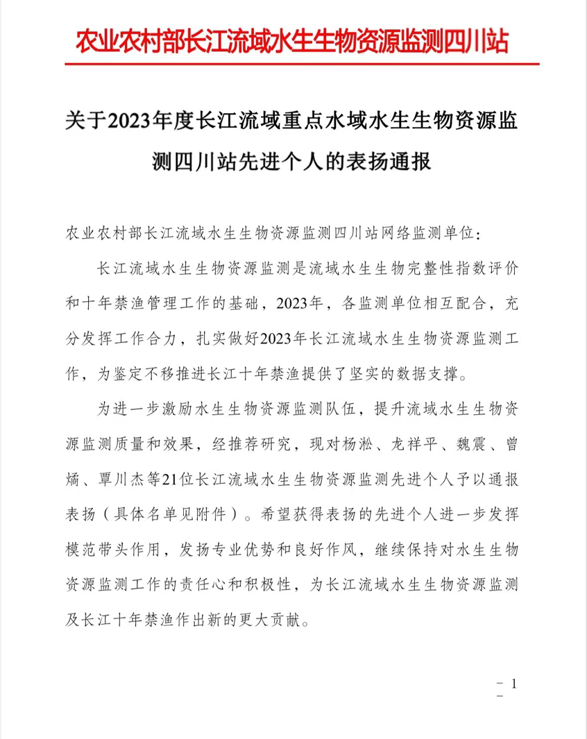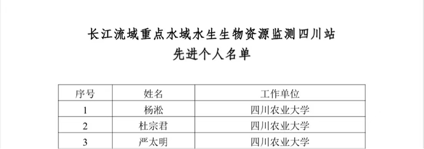 近日,2023年度四川省长江流域重点水域水生生物资源监测总结表彰暨2024年工作启动会在四川省水产局召开。四川农业大学水生生物监测团队获评雅安市2023年水生生物监测先进集体,动科院副院长杨淞、杜宗君和严太明三位老师荣获长江流域重点水域水生生物资源监测四川站先进个人。