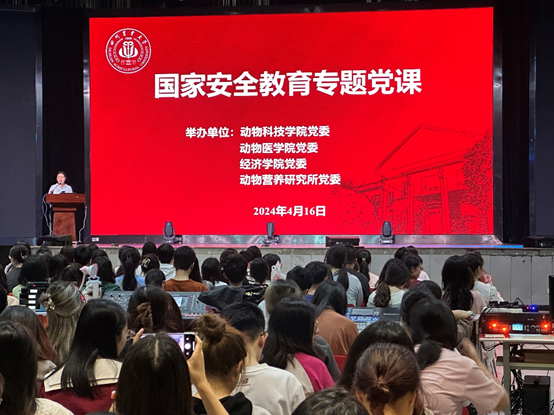 学院党委与动物医学院、经济学院、动物营养研究所党委在麦立方联合举办“备豫不虞 为国常道 总体国家安全观 创新引领十周年”国家安全教育专题党课,组织全院师生党员共上一堂课,充分发挥课堂主渠道作用,内容涉及政治安全、国土安全、网络安全等多个方面,主讲人深入浅出地阐述国家安全的重要意义、当前国家安全面临的总体形势、如何维护国家安全等内容,帮助师生系统了解国家安全相关知识引导学院专业教师将国家安全教育融入课程教育,提升学院教师关于国家安全教育的教育能力,从而更好地发挥教育效能。