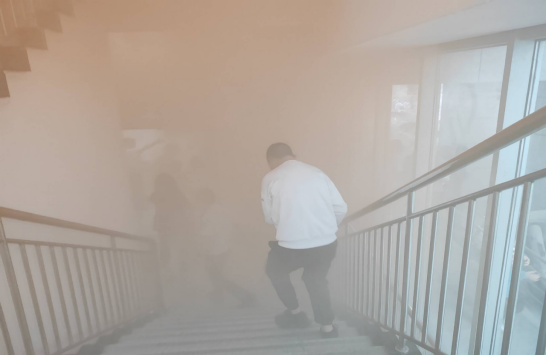 培训讲解结束,保卫处负责老师拉响警报并打开烟雾管,在浓浓烟雾中开始应急逃生演练。师生们在负责老师的组织下捂住口鼻、低头弯腰,迅速有序地按照安全出口指示牌从4楼逃生到户外安全区域。