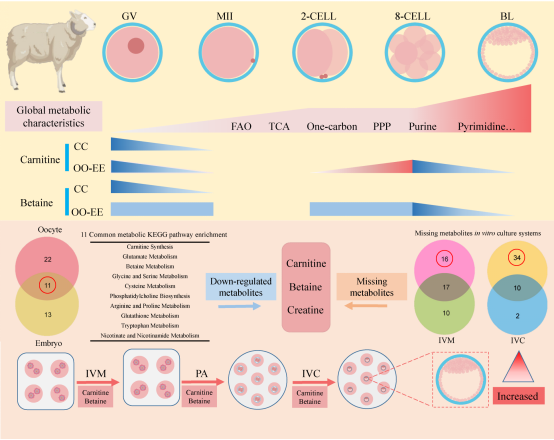 通过利用超灵敏微量代谢组学技术和单细胞转录组学技术,我们对绵羊卵母细胞体外成熟及早期胚胎体外发育的代谢特征进行了解析:从GV期卵母细胞至2-细胞胚胎阶段整体代谢水平呈上升趋势,为促进卵母细胞成熟和合子发育提供了必要的代谢底物;而在2-细胞胚胎至8细胞胚胎阶段,整体代谢表现出安静状态,有助于减少氧化应激对细胞的损伤;而在8-细胞胚胎至囊胚阶段,整体代谢水平又明显增加,为早期囊胚的形成、增殖分化以及表观修饰过程提供能量和所需的代谢底物。同时,鉴定出肉毒碱、甜菜碱和肌酸为该体外培养系统所缺失的关键代谢物。进一步研究发现,肉毒碱可促进绵羊卵母细胞脂肪酸氧化,并降低脂质含量和脂质过氧化水平,同时还可以调节纺锤体形态。而甜菜碱则具有调节绵羊早期胚胎发育过程中渗透压应激和甲基化修饰的作用。当联合肉毒碱与甜菜碱添加至体外培养体系时,显著提高了绵羊卵母细胞的囊胚发育率。