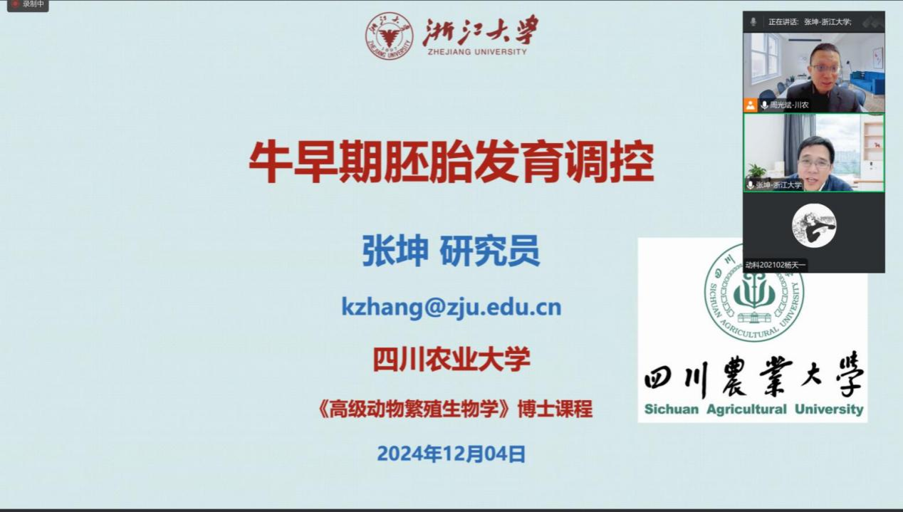 12月4日上午,我校动物科技学院邀请浙江大学动物科学学院张坤教授进行了题为“牛早期胚胎发育调控”的线上学术报告。报告由动科学院周光斌教授主持,动物科学相关专业的博士研究生及本科生线上参与了本次报告。
