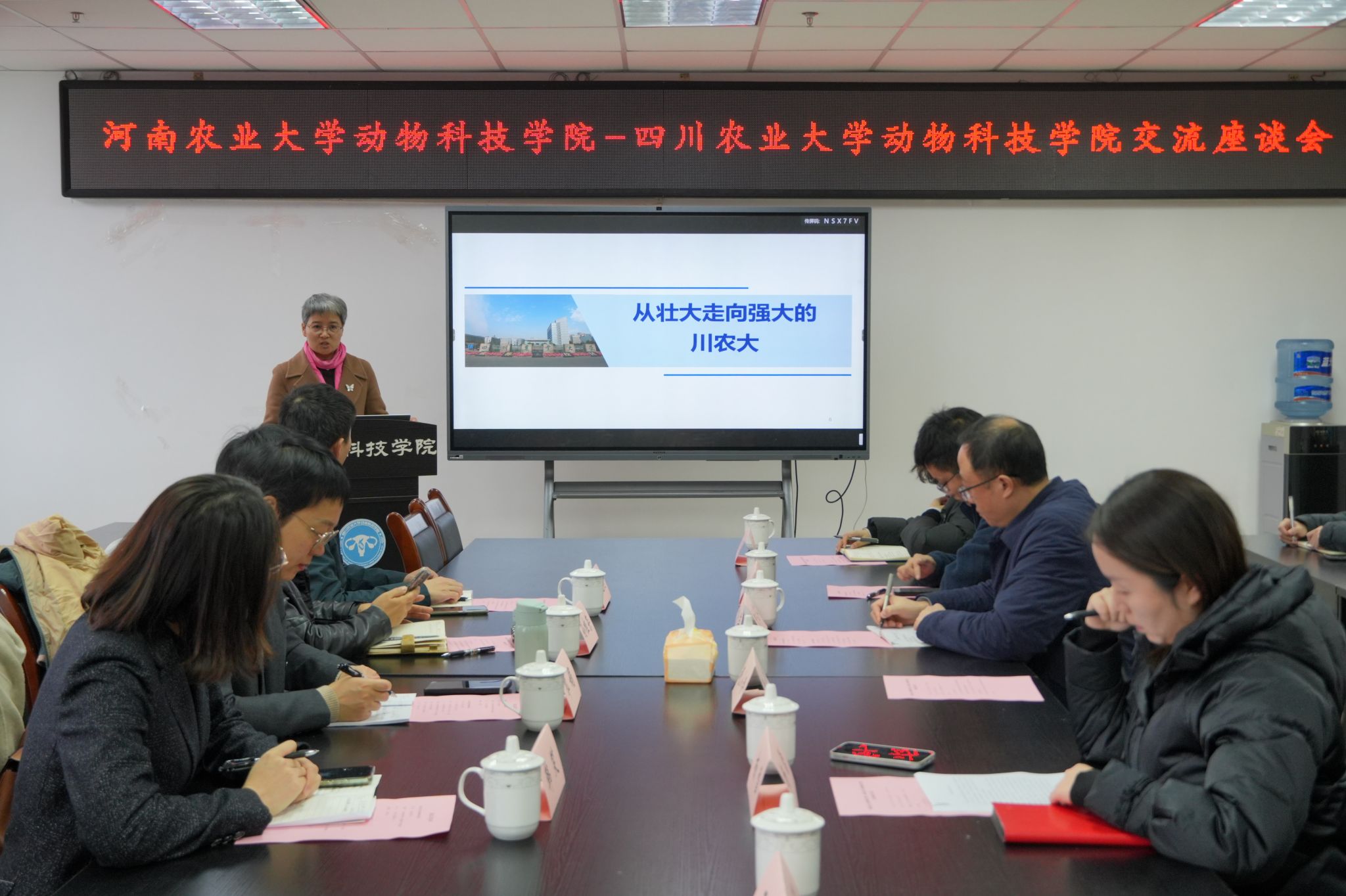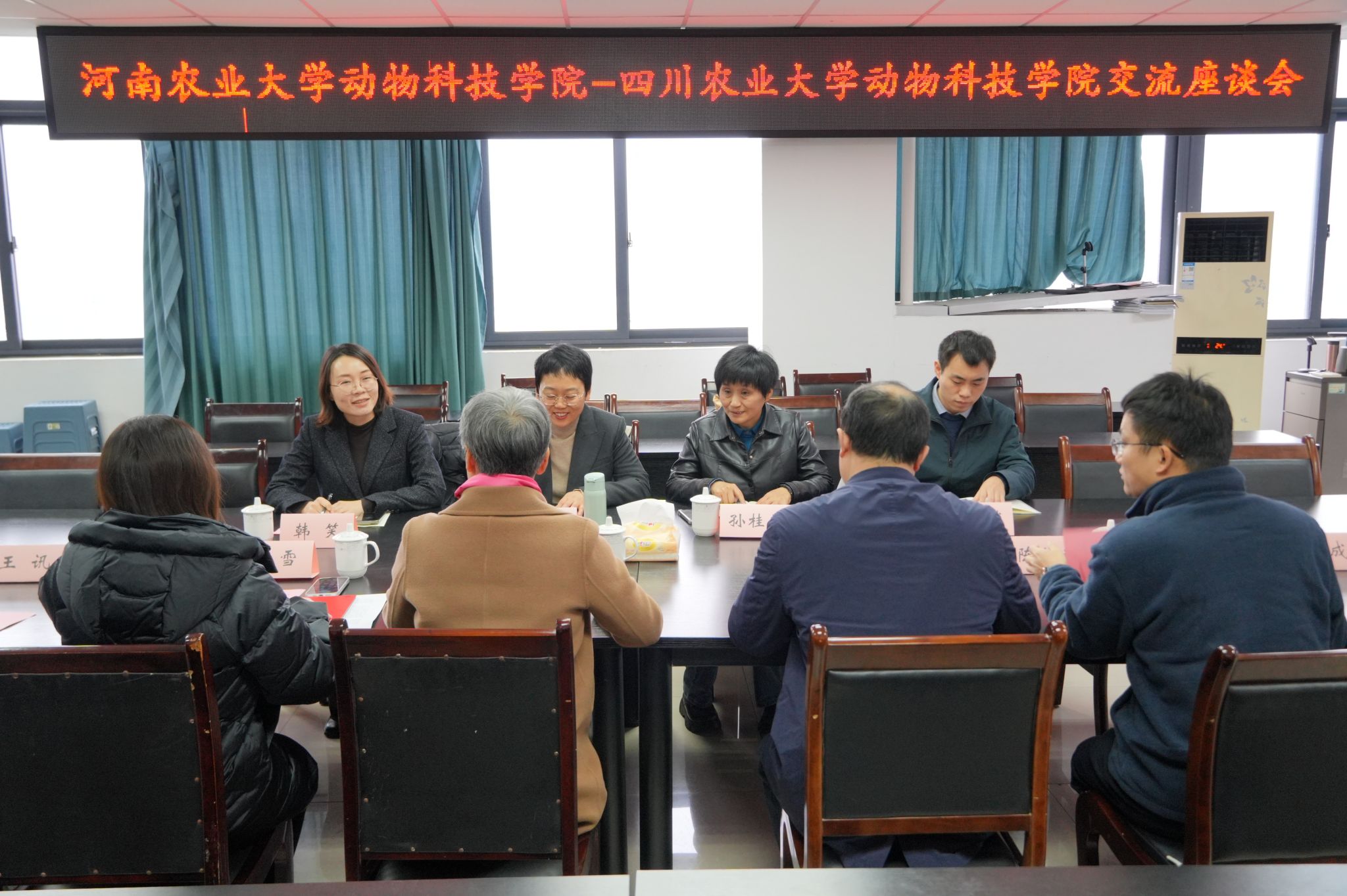 12月11日,河南农业大学动物科技学院党委副书记郭娟一行四人到动科学院调研交流。动物科技学院副院长赵小玲,党委副书记、纪委书记杨雪,动物科学系主任、专业负责人曾长军,动物科学系副主任王讯、动物遗传育种研究中心主任陈仕毅等老师参加座谈交流会。会议由赵小玲主持。