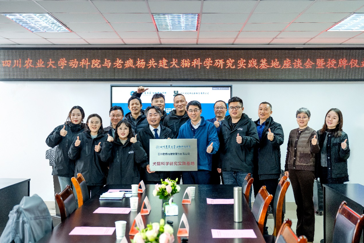 12月19日,动科学院与四川老疯杨宠物服务有限公司(以下简称“老疯杨”)犬猫科学研究实践基地挂牌仪式在四川农业大学成都校区7-1012会议室举行。老疯杨董事长、总经理杨兴,副总经理于航宇、技术顾问苟安春、学院院长朱砺、副院长赵小玲、杨淞及相关负责人出席授牌仪式,党委副书记、纪委书记杨雪主持会议。