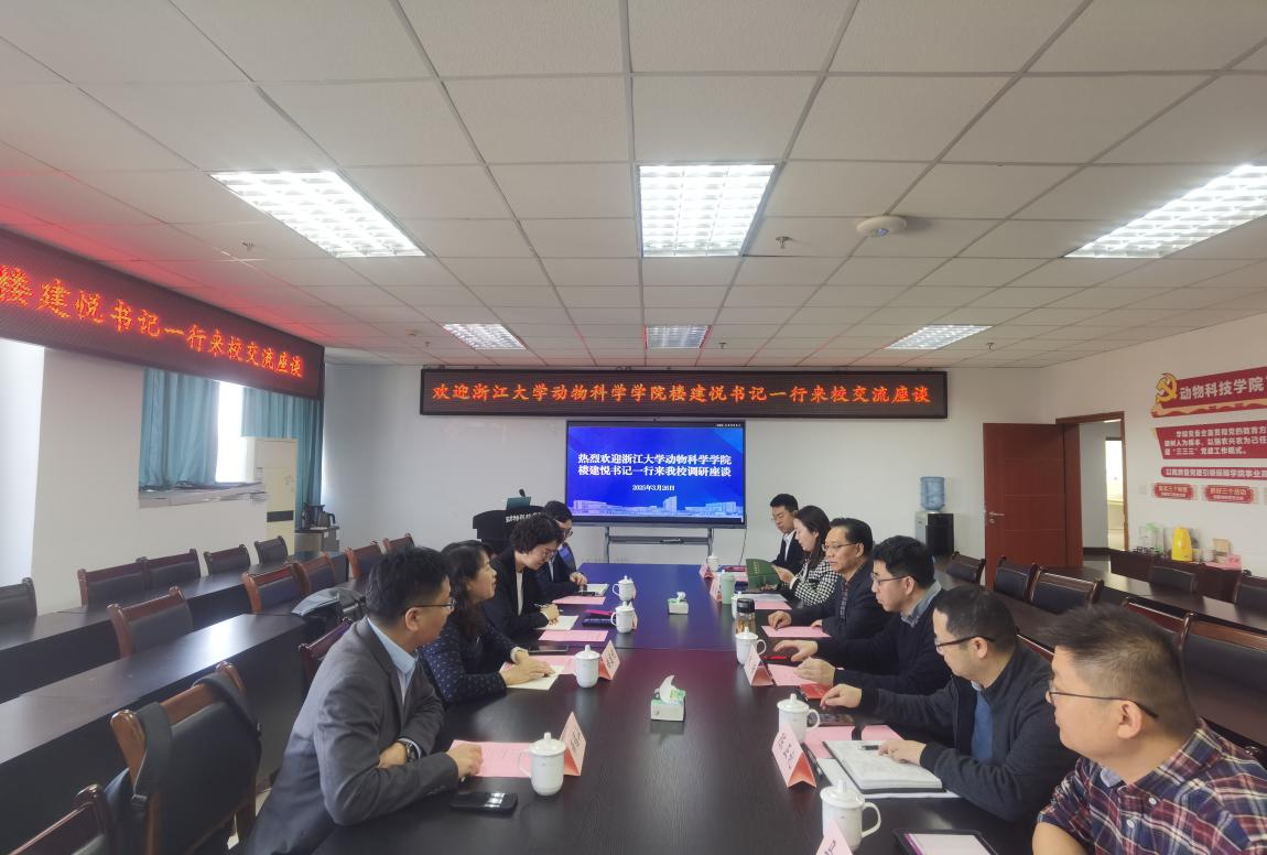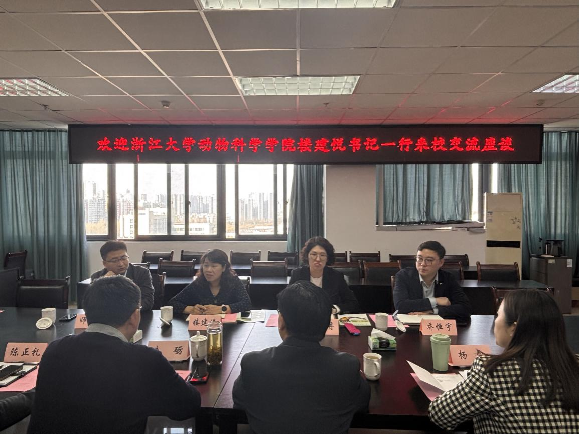 3月26日,浙江大学动物科学学院党委书记兼副院长楼建悦一行4人到动物科技学院、动物医学院开展学科建设与人才培养专题调研。原学校副校长陈代文教授、动物科技学院院长朱砺,党委副书记、纪委书记杨雪,动物医学院党委副书记、纪委书记宋三多,副院长陈正礼等7人参加座谈。座谈会由杨雪主持。