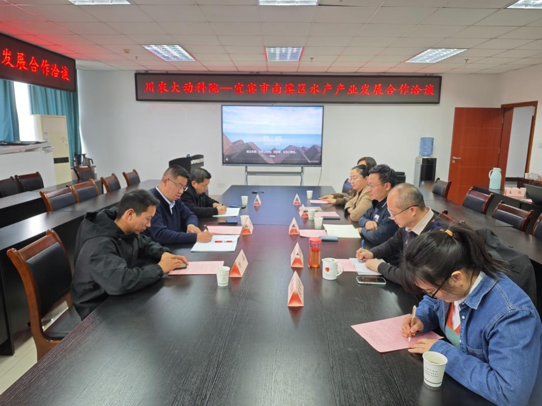 3月28日下午,宜宾市南溪区畜牧水产业发展服务中心段义彬主任一行到访我院,就深化校地水产产业战略合作开展专题洽谈。动科学院副院长杨淞,水产养殖系系主任陈德芳、系副主任杨世勇等6名老师参会。