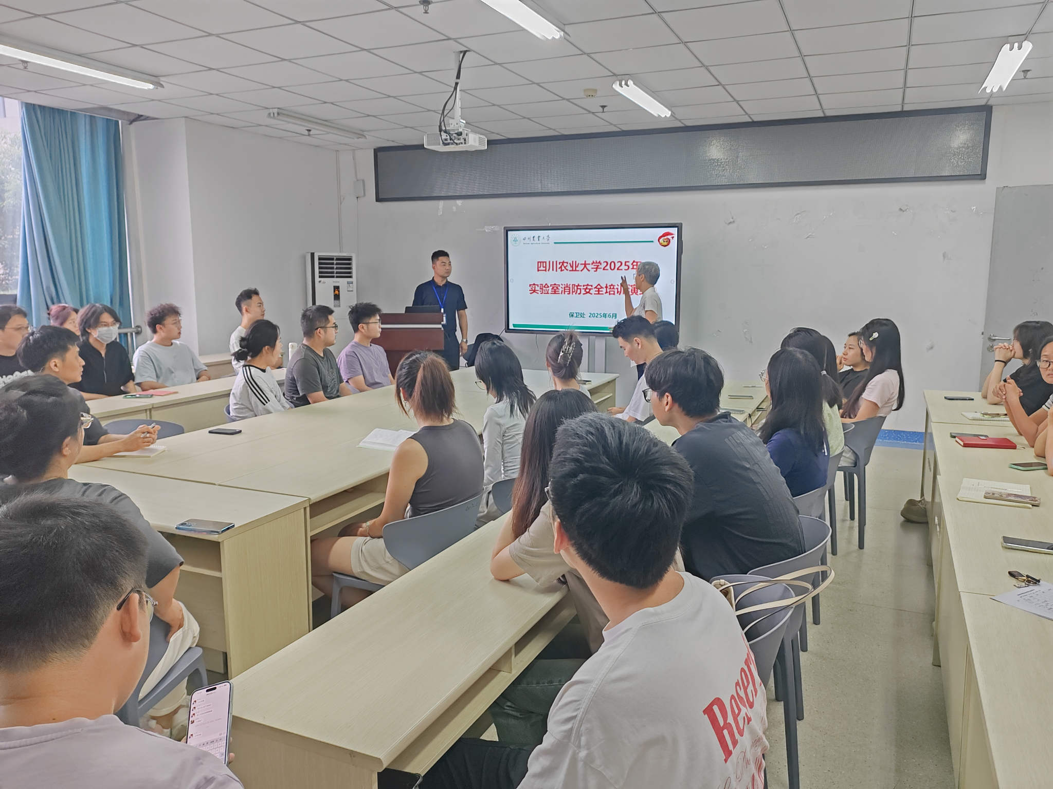 为提升师生实验室安全风险防范意识与应急处置能力,筑牢安全防线,6月27日下午,动物科技学院联合学校保卫处成功举办了实验室安全专题培训及消防应急演练活动。学院副院长赵小玲、实验中心全体成员、学校保卫处相关教师及学院教师、研究生代表等五十余人参加。