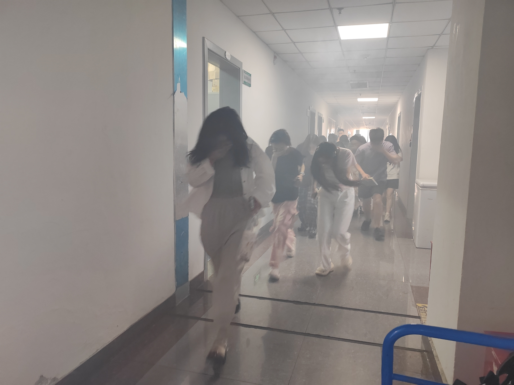 理论培训后,一场逼真的模拟火灾逃生演练在6教4楼迅速展开。警报响起,模拟烟雾弥漫,参与师生在安全引导员指挥下,严格遵循培训要点:保持冷静、弯腰低姿、用湿毛巾捂住口鼻,沿预定路线快速、有序撤离“火场”,安全到达集合点。演练过程组织严密,行动高效。