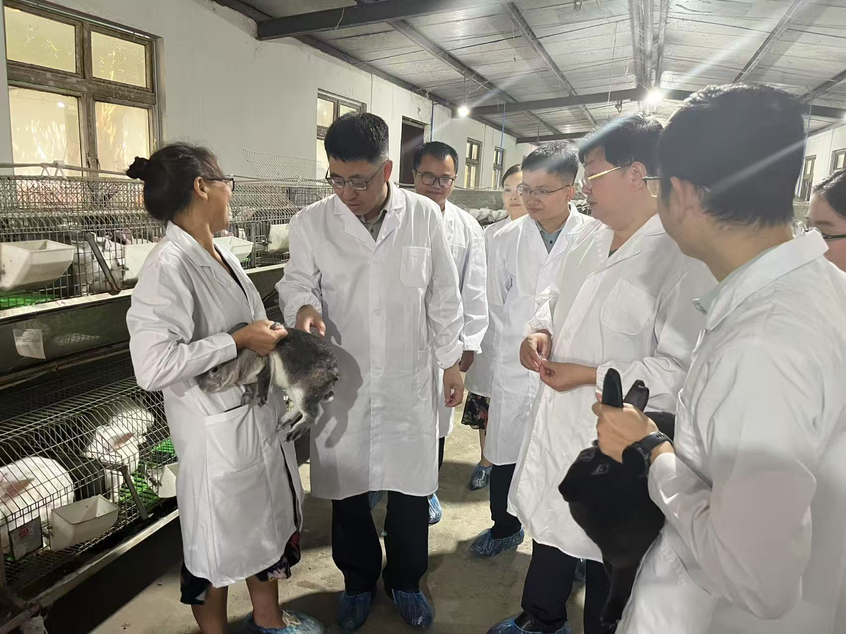 在刘汉中研究员的带领下,朱砺教授团队首先实地参观了该院韩场兔养殖基地。刘汉中详细介绍了基地的发展历程、行业现状与机遇、以及开展生物育种的条件支撑等情况,总结了动科学院研究生在该基地开展实习实践和科学实验的情况。朱砺教授认真听取介绍,并就基地现有的品种资源、育种素材储备、生物育种技术应用程度、以及研究生联合培养等方面进行了深入了解。