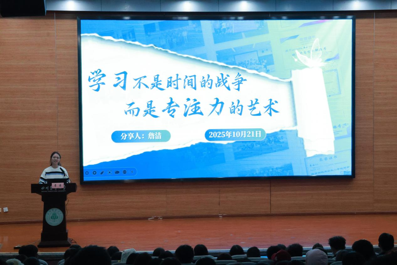 第三位主讲人詹洁围绕“多重角色下的时间管理”展开分享。尽管她身兼数职,仍能平衡学习、工作与生活,不仅在校期间屡获荣誉,更成功考取名校继续深造。她提出“学习不是时间的战争,而是专注力的艺术”,分享了如何在纷繁事务中保持高度专注、实现学业与工作双赢的实用方法,为同学们提供了可借鉴的时间管理路径。