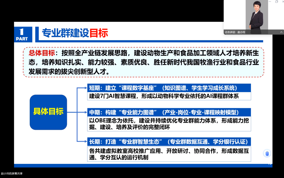 赵小玲教授分享了四川农业大学动物科技学院在专业图谱和智慧课程方面的实践经验。她强调了素质教育在教育改革中的重要性,并指出了一些具体的问题,如课程知识点重复、数字化工具应用不足等,分析了国家对于高水平研究型大学的要求以及地方院校在产教融合、科教融合方面的探索。