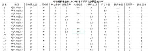 根据《动物科技学院学风建设先进集体评选办法》对全院大二、大三、大四年级31个班级的学风状态数据进行了统计排名,前三名的班级直接获评学风建设先进班集体,第4至15名的班级可自愿申请参加评选答辩。
