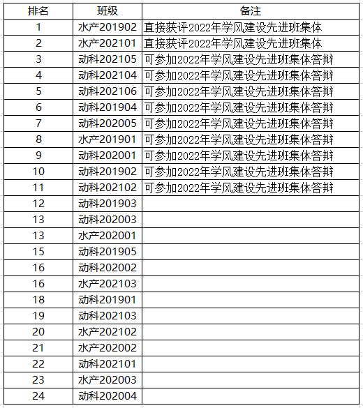 根据《动物科技学院学风建设先进集体评选办法》对全院大二、大三、大四年级24个班级的学风状态数据进行了统计排名,前两名的班级直接获评学风建设先进班集体,第3至11名的班级可参加评选答辩。