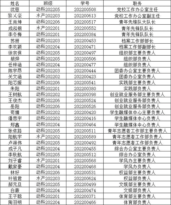 按照《学院关于党团学组织主要学生干部换届调整的通知》相关要求,经学生自主申报、各部门、团支部初审推荐、换届工作领导小组进行资格复审及面试,经学院团委同意、学院党委确定,现将第十七届党团学组织主要学生干部名单公布如下: