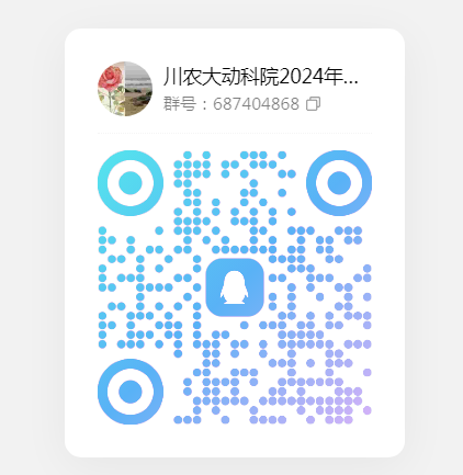 1.报名:即日起至2024年6月30日,请附合条件有意参加的同学加入动物科技学院2024年夏令营咨询QQ群:687404868。并将申请所涉及电子材料打包,以“姓名-动科院夏令营申请”命名发送至邮箱1657897514@qq.com。同时扫码填写“四川农业大学动物科技学院2024年暑期夏令营信息收集表”。申请者须如实填写报名材料相关信息,如有不实将被取消入营资格或录取资格。