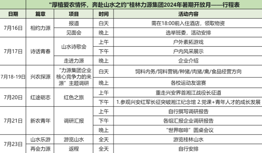 为进一步加强校企合作,深化产教融合,提高人才培养质量。力源集团致力于与各高校联合培养知农学农爱农、理论与实践双轨道发展的复合型青年人才。力源集团将于2024年7月16日-7月23日在集团总部广西桂林,开展“厚植爱农情怀,奔赴山水之约”桂林力源集团2024年第七届暑期开放月社会实践活动。诚邀本院师生参与,深入了解农牧行业的现代化发展现状,切身感受从农场到餐桌完整产业链。