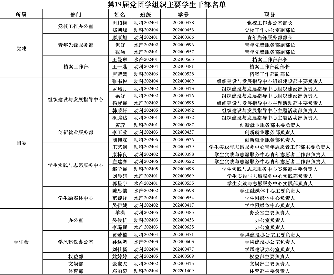 按照《学院关于党团学组织主要学生干部换届调整的通知》相关要求,经学生自主申报、各部门、团支部初审推荐、换届工作领导小组进行资格复审及面试,经学院团委同意、学院党委确定,现将第十九届党团学组织主要学生干部名单公布如下: