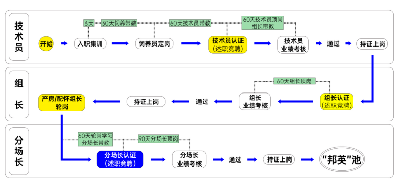 ★ 大学生6-12个月轮岗培训(以生产技术岗为例):第1个月饲养员岗位实训——第2至第3个月技术员岗位带教——第4至第6个月生产组长岗位带教——第9至12个月实习分场长岗位带教
