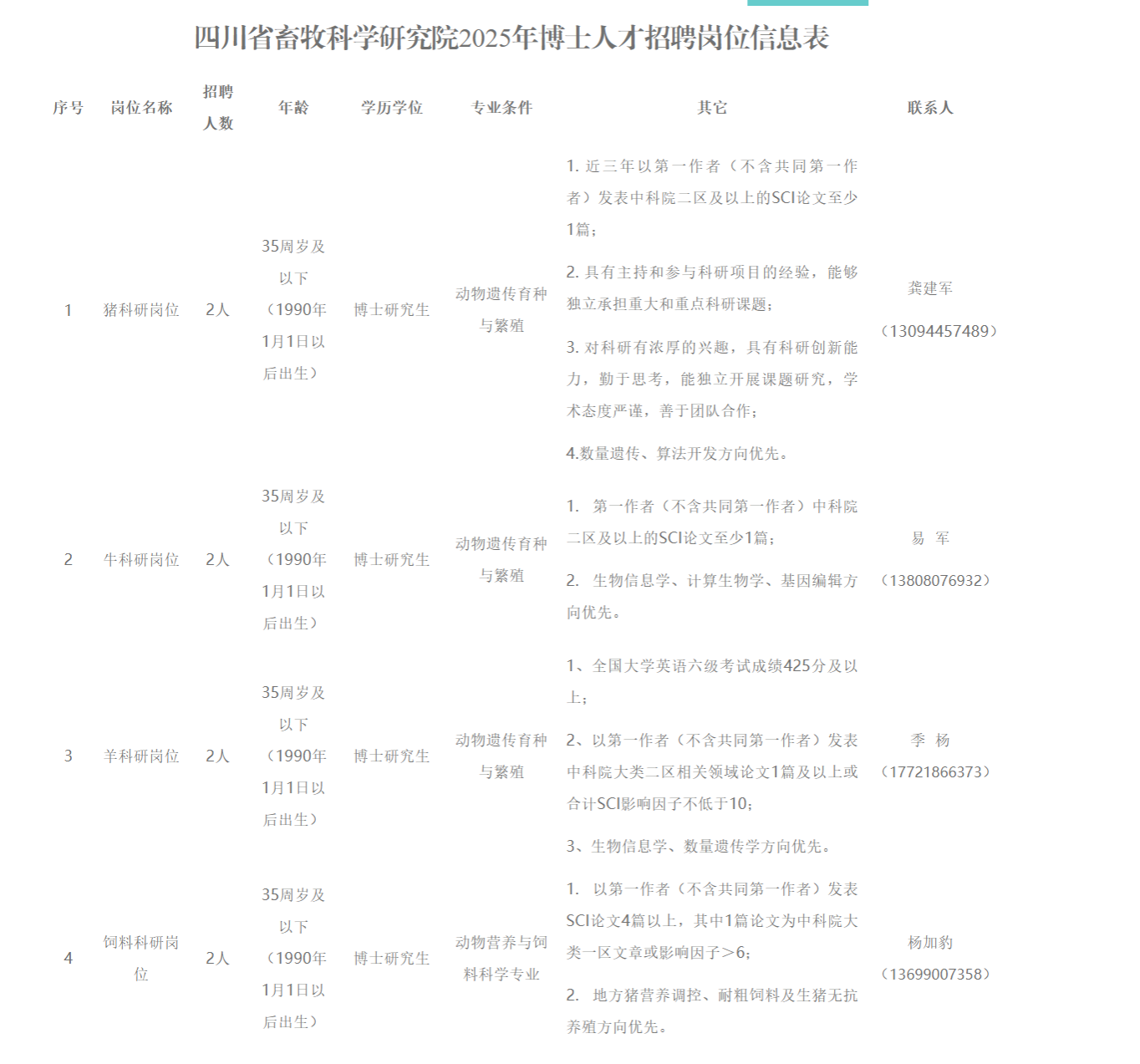 本次招聘岗位为编外科研岗位,详见《四川省畜牧科学研究院2025年博士人才招聘岗位信息表》(附件1)。